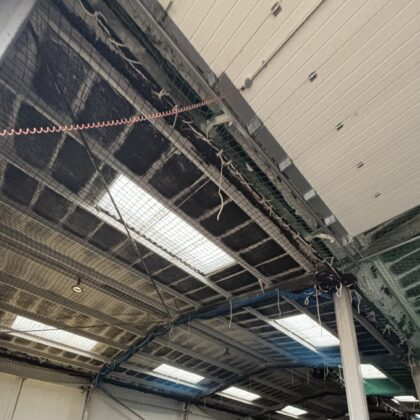 When undertaking reroofing works, internal safety netting is suspended beneath the roof structure to protect operatives from falls and prevent debris from falling into the workspace below.